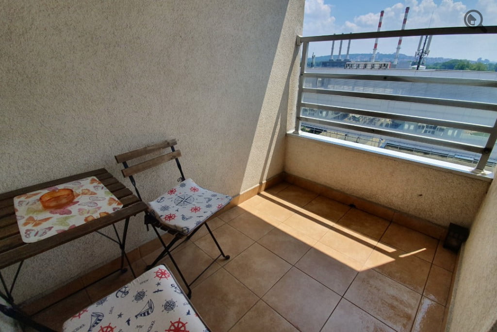 Apartman poseduje zatvorenu terasu koja je funkcionalno povezana sa dnevnim boravkom, koja je opremljena garniturom za sedenje, i iz koje se pruža dinamičan pogled na šoping centar Delta Sity i prilazne saobraćajnice kompleksu Belville.